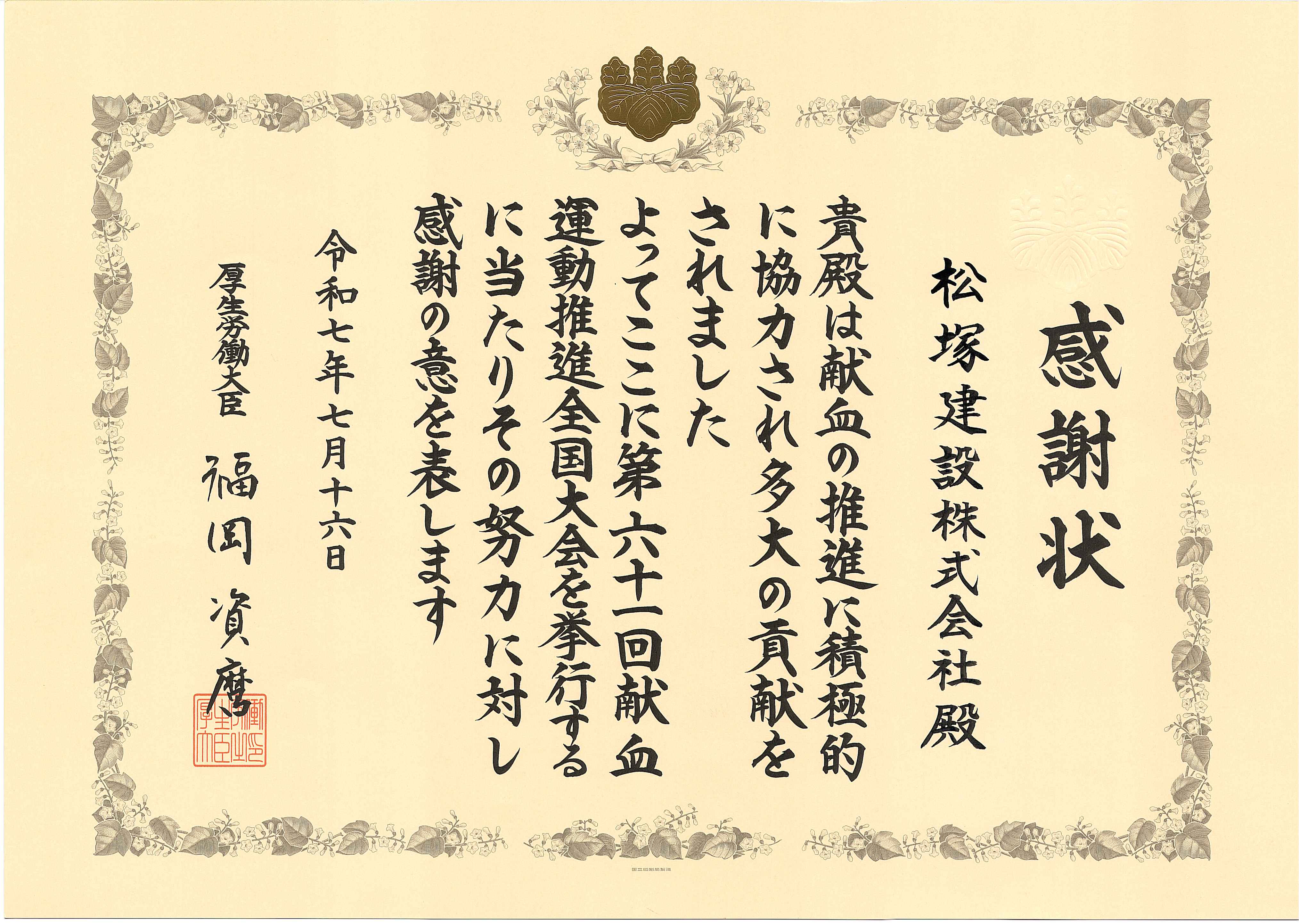 厚生労働大臣感謝状は、長年に渡り献血に協力し顕著な功績のあった団体に贈られるものです。