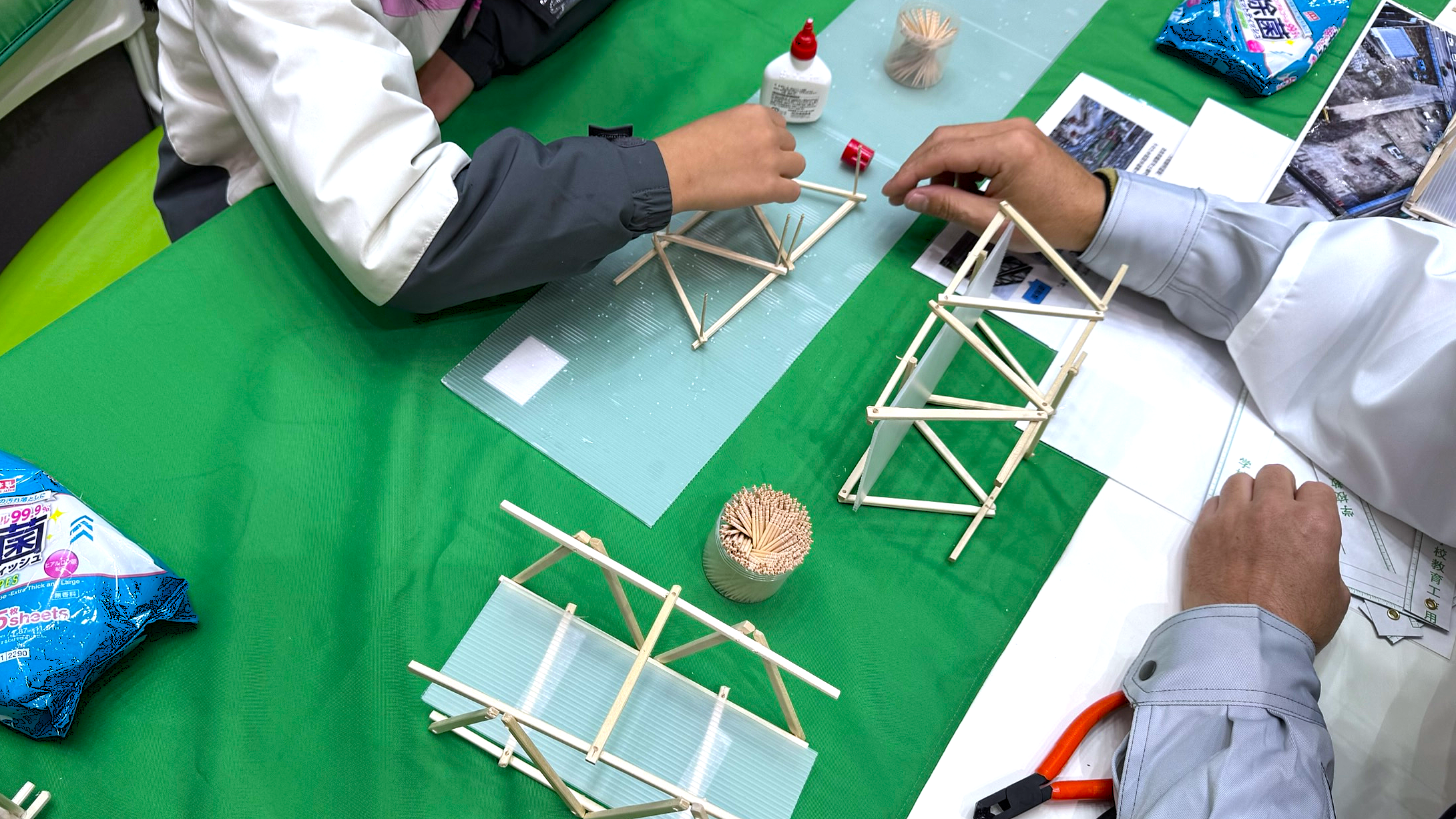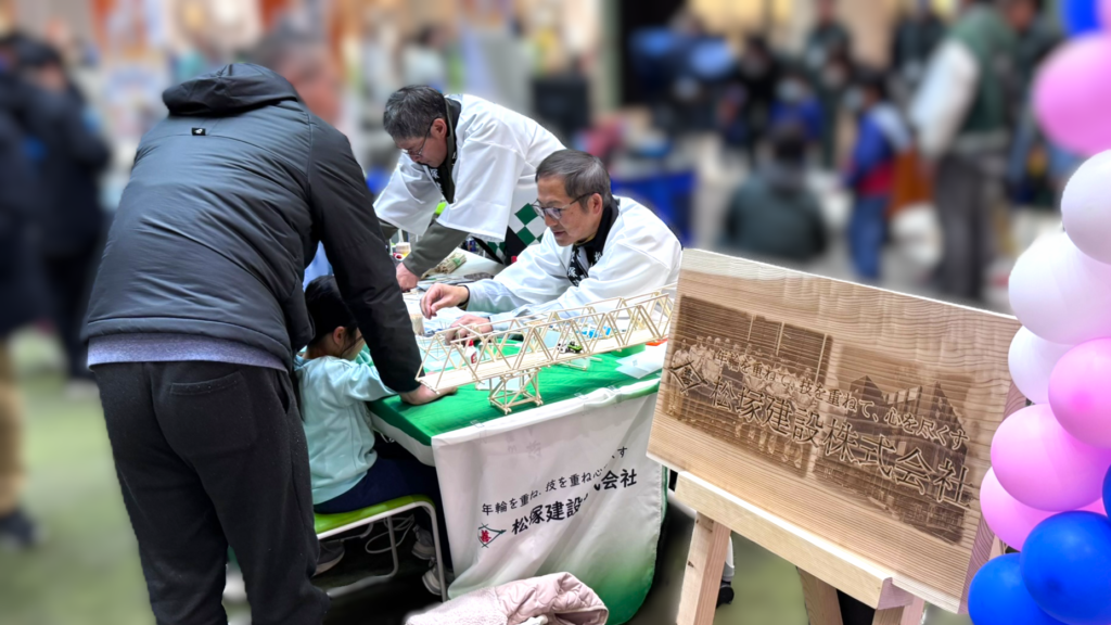 当社ブースでは、割り箸を使ったトラス橋づくり体験を実施し、子どもたちが構造の仕組みを理解しながら真剣な表情で橋づくりに挑戦していました。