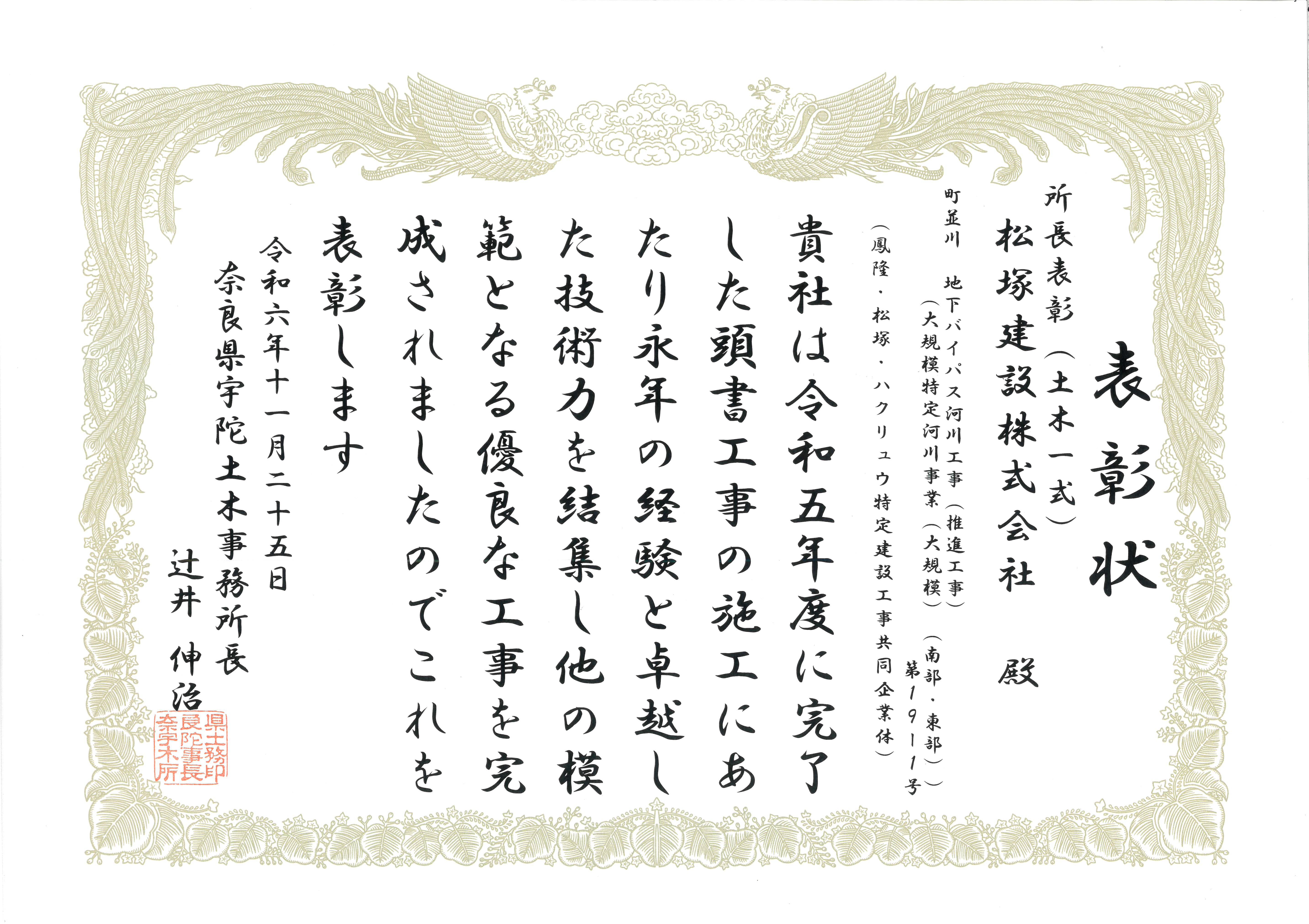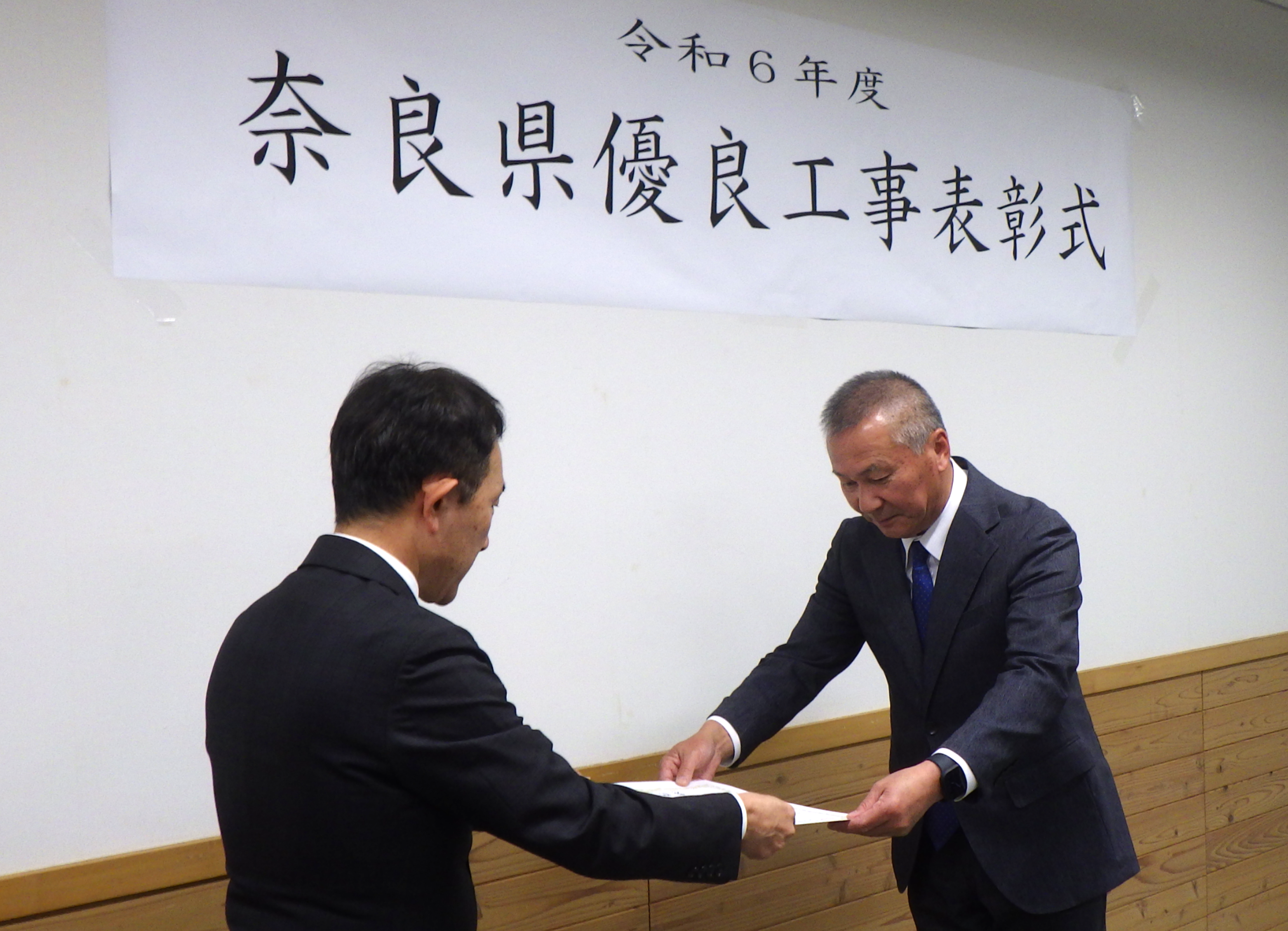 令和6年11月26日に奈良県宇陀土木事務所長より、「令和6年度 奈良県優良工事表彰」をいただきました。