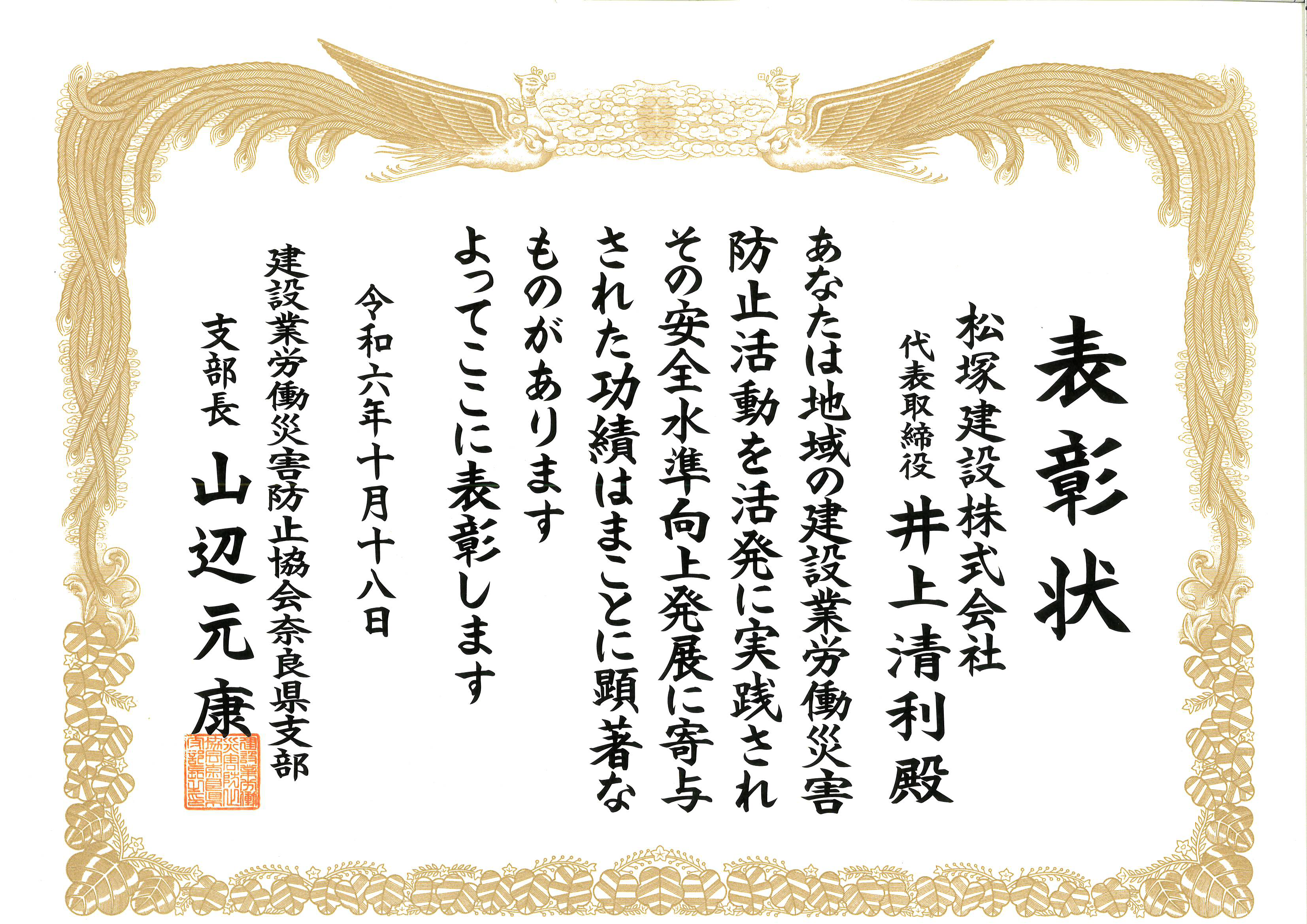 令和6年10月18日に開催されました奈良県産業安全衛生大会にて、「建設業労働災害防止協会 奈良県支部長表彰」の功績賞を受賞いたしました。