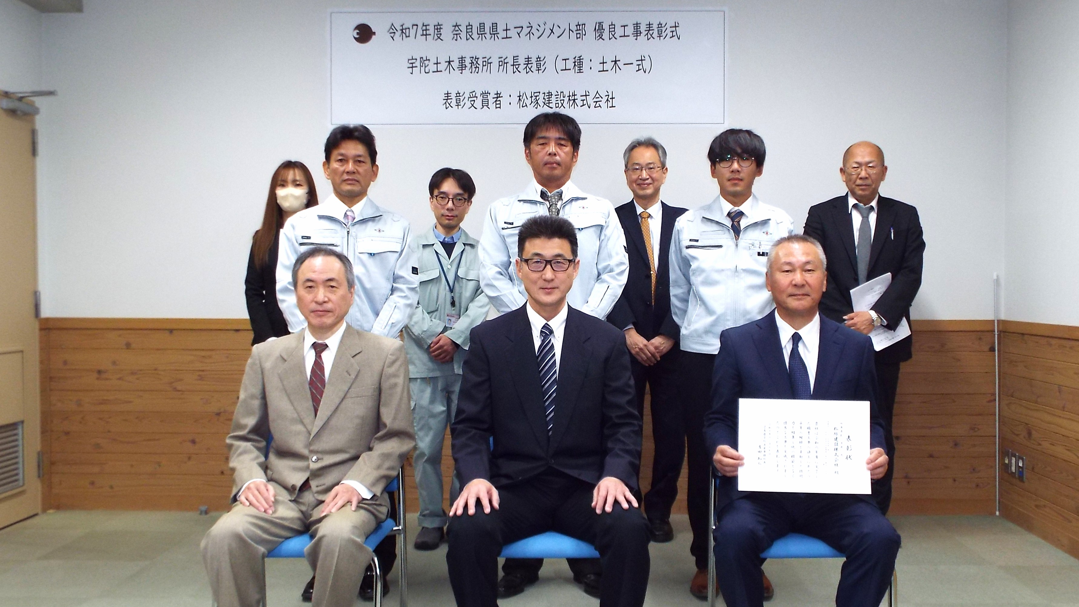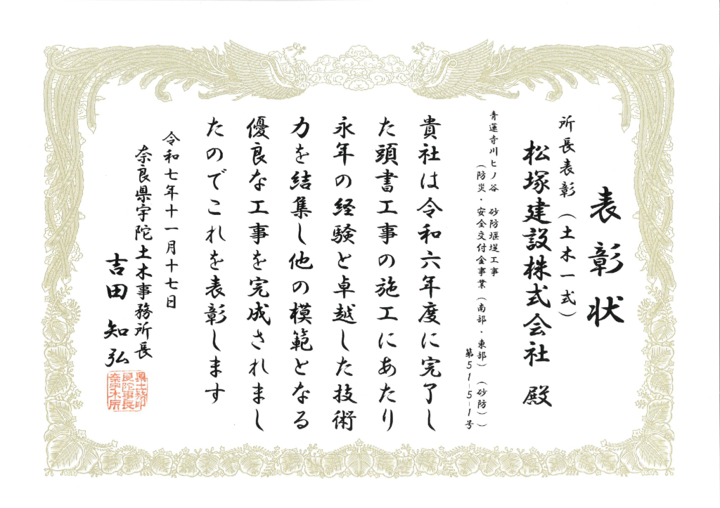 和7年11月21日に執り行われた「令和7年度 奈良県県土マネジメント部優良工事表彰式」において、「優良工事表彰」を宇陀土木事務所長よりいただきました。